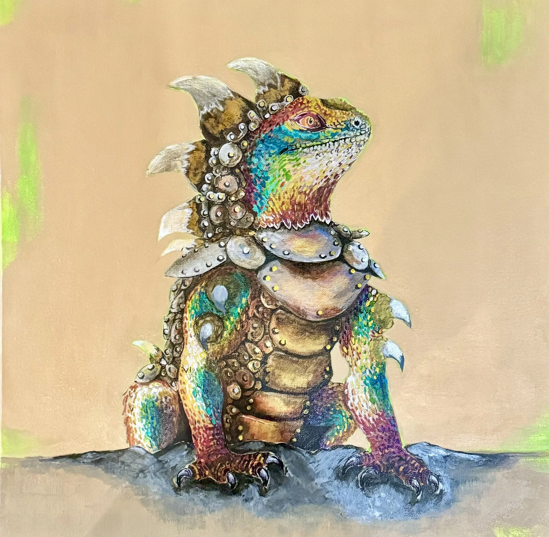 This ain't your average thorny devil. Forget the drab browns of the desert; this little critter's been dipped in a rainbow of oil slick hues – a rebellious splash of colour against the harsh outback landscape. But beneath that iridescent sheen lies a warrior's spirit. Gleaming metal accents, like the pistons of a desert steam engine, adorn his regal back, a testament to his resilience and his own unique brand of survival. He may be small, but his stance is defiant, a Mad Max steampunk renegade ready to take on the wasteland.