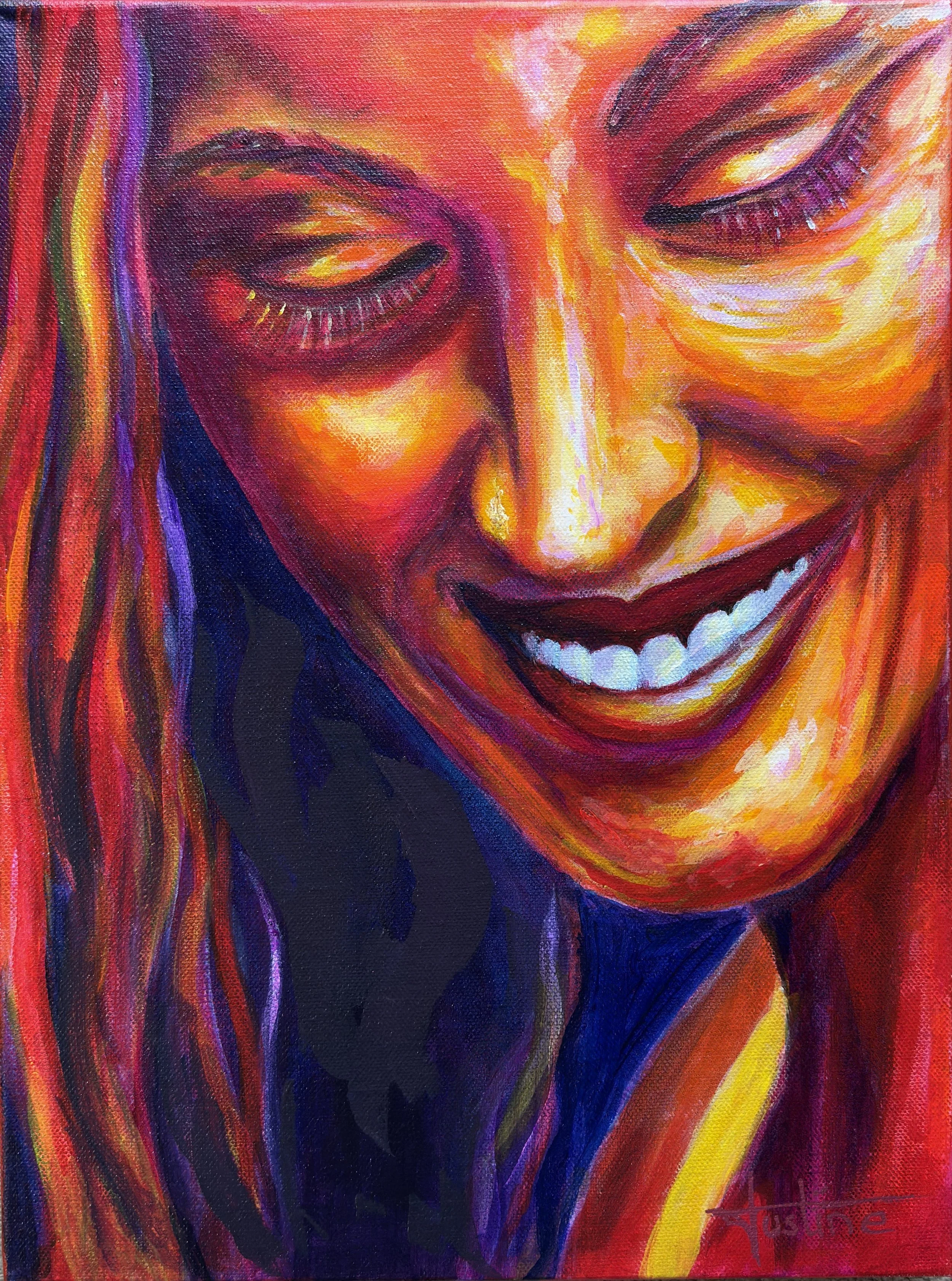 Bathed in a warm, golden light, a woman embodies pure contentment. Her features are serene, a soft smile playing on her lips as she gazes downward. There's a sense of intimacy in the scene, as if she's lost in a private moment of joy. The rich red tones surrounding her create a sense of warmth and comfort, like the sun's rays embracing her in a gentle hug. This portrait is a captivating study of quiet happiness, a reminder to savour the simple pleasures of a sun-drenched moment.